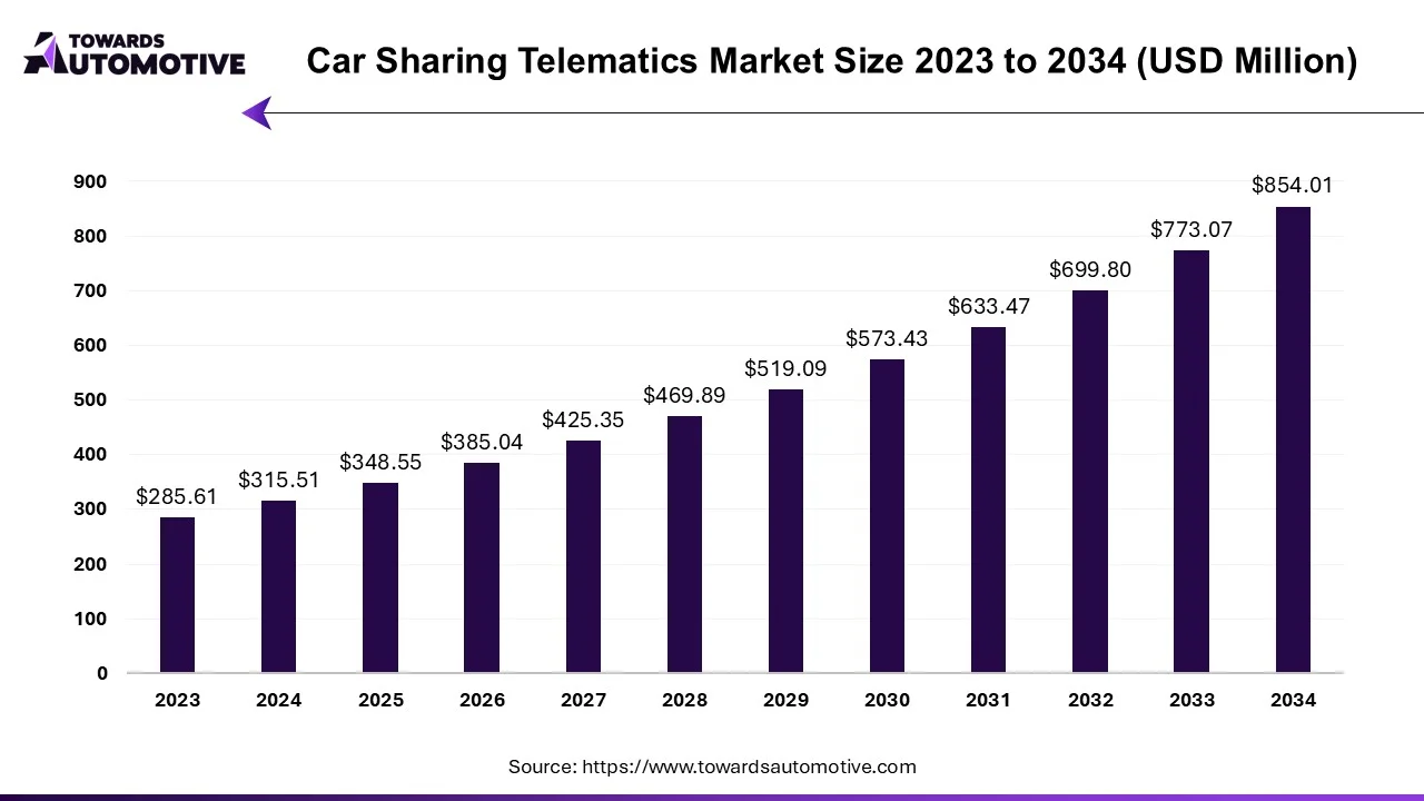 According to Towards Automotive consultants, the global car sharing telematics market is projected to reach approximately USD 854.01 billion by 2034, increasing from USD 385.04 billion in 2026, at a CAGR of 10.47% during the forecast period 2025 to 2034.